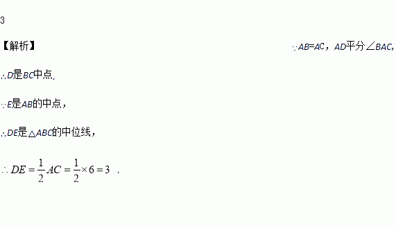 如图,已知△ABC中,AB=AC,AD平分∠BAC,E是AB的中点,若AC=6,则DE的长为 _____________