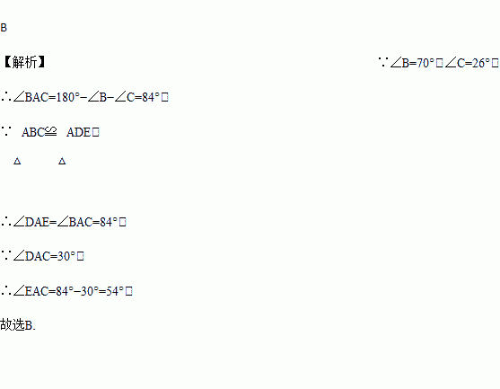 如图,△ABC≌△ADE,∠B=70°,∠C=26°,∠DAC=30°,则∠EAC=( )