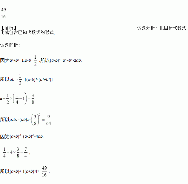 已知a2+b2=1,a-b=,求a2b2与(a+b)4的值.