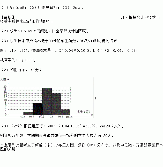 (3)若该校八年级共有600名学生,且各个班级学生成绩分布基本相同,请估计该校八年级上学期期末考试成绩低于70分的学生人数.