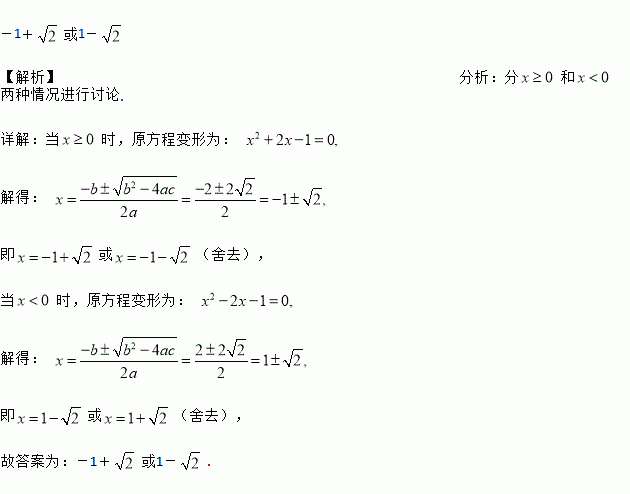 方程x2+2|x|-1=0的根为________________.