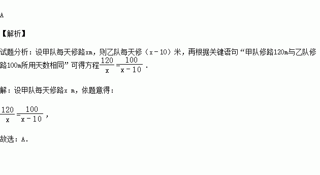 甲队修路120m与乙队修路100m所用天数相同,已知甲队比乙队每天多修10m.设甲队每天修路xm,依题意,下面所列方程正确的是( )