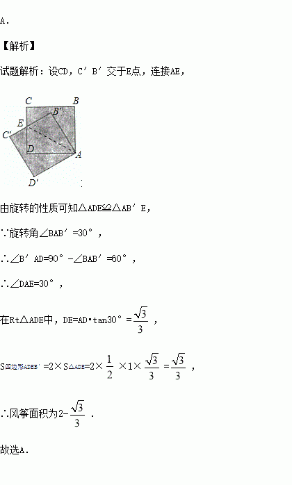 如图,边长为1的正方形ABCD绕点A逆时针旋转30°得到正方形AB′C′D′,两图叠成一个“蝶形风筝”(如图所示阴影部分),则这个风筝的面积是( )