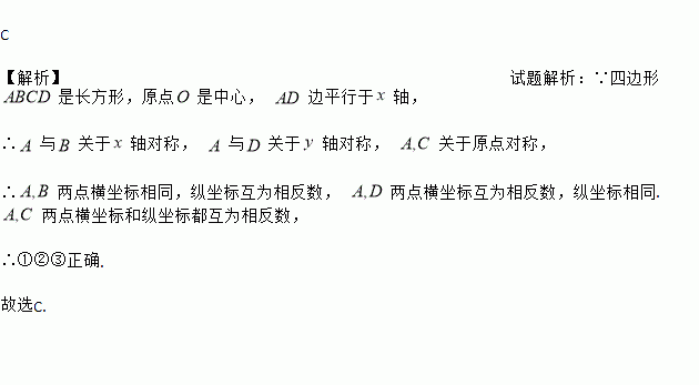 C 【解析】试题解析:∵四边形是长方形,原点是中心, 边平行于轴, ∴与关于轴对称, 与关于轴对称, 关于原点对称, ∴两点横坐标相同,纵坐标互为相反数, 两点横坐标互为相反数,纵坐标相同. 两点横坐标和纵坐标都互为相反数, ∴①②③正确. 故选C.