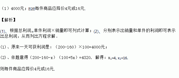 (2)设后来该商品每件降价x元,若商场经营该商品一天要获利润4320元,则每件商品应降价多少元?