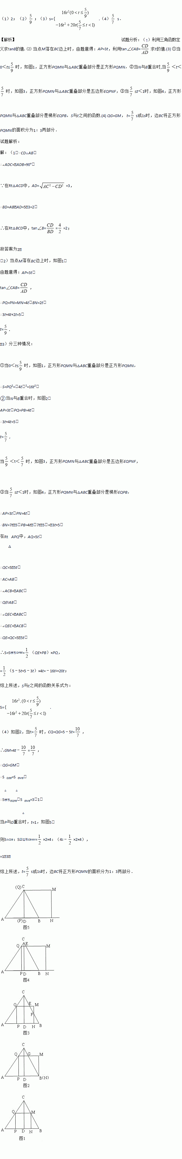 如图,在△ABC中,AB=AC=5,AB边上的高CD=4,点P从点A出发,沿AB以每秒3个单位长度的速度向终点B运动,当点P不与点A、B重合时,过点P作PQ⊥AB,交边AC或边BC于点Q,以PQ为边向右侧作正方形PQMN.设正方形PQMN与△ABC重叠部分图形的面积为S(平方单位),点P运动的时间为t(秒).