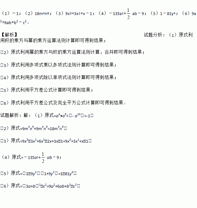 (1)-1;(2)18m4n6;(3)9x3+3x2+x﹣1;(4)﹣135a2+ab﹣9;(5)1﹣81y4;(6)9a2+6ab+b2﹣c2. 【解析】试题分析:(1)原式利用积的乘方与幂的乘方运算法则计算即可得到结果; (2)原式利用幂的乘方与积的乘方运算法则计算,合并即可得到结果; (3)原式利用多项式乘以多项式法则计算即可得到结果; (4)原式利用多项式除以单项式...