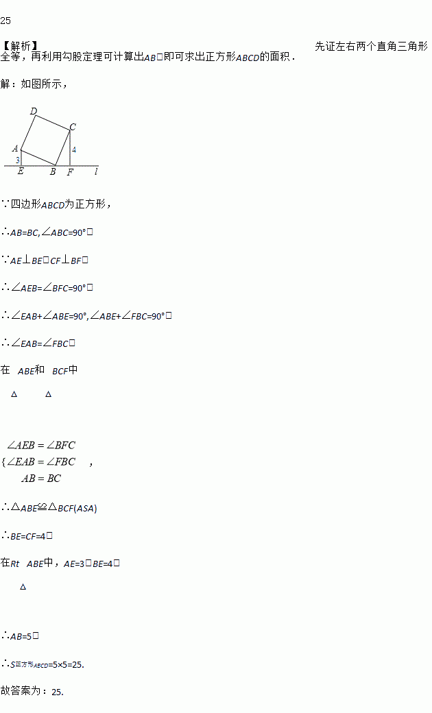 如图,直线l过正方形ABCD的顶点B,点A、点B到直线l的距离分别是3和4,则该正方形的面积是__________.