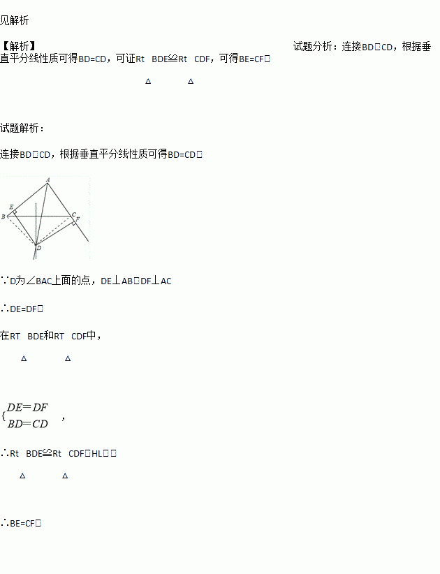 已知:如图∠BAC的角平分线与BC的垂直平分线交与点D,DE⊥AB ,DF⊥AC ,垂足分别为E,F.求证:BE=CF.