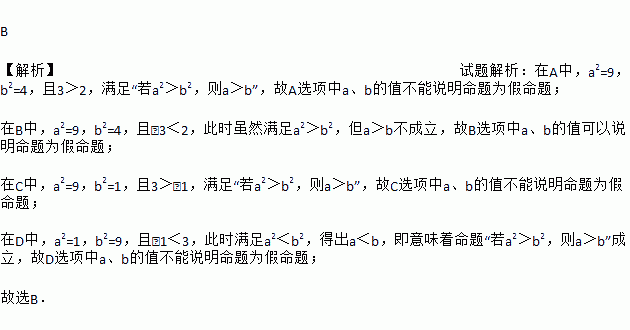 B 【解析】试题解析:在A中,a2=9,b2=4,且3>2,满足“若a2>b2,则a>b”,故A选项中a、b的值不能说明命题为假命题; 在B中,a2=9,b2=4,且﹣3<2,此时虽然满足a2>b2,但a>b不成立,故B选项中a、b的值可以说明命题为假命题; 在C中,a2=9,b2=1,且3>﹣1,满足“若a2>b2,则a>b”,故C选项中a、b的值不能说明命题为假命题; ...