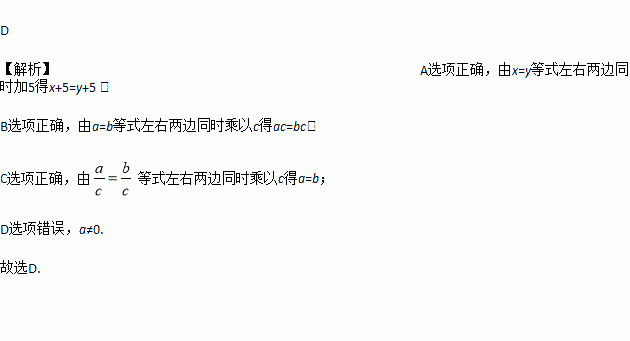 A. 若x=y,则x+5=y+5 B. 若a=b,则ac=bc