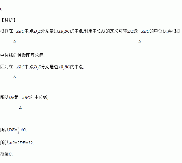 在△ABC中,点D,E分别是边AB,BC的中点.若DE=6,则AC=( )