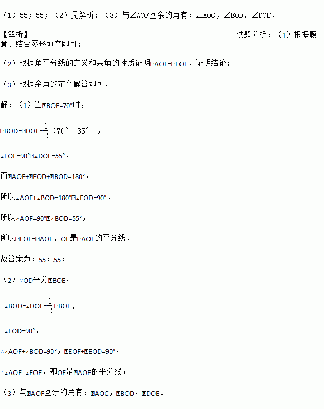 ×70°=35°,∠EOF=90°﹣∠DOE= °,而∠AOF+∠FOD+∠BOD=180°,所以∠AOF+∠BOD=180°﹣∠FOD=90°,所以∠AOF=90°﹣∠BOD= °,所以∠EOF=∠AOF,OF是∠AOE的平分线.