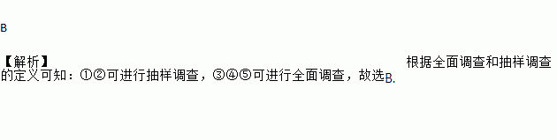 B 【解析】根据全面调查和抽样调查的定义可知:①②可进行抽样调查,③④⑤可进行全面调查,故选B.