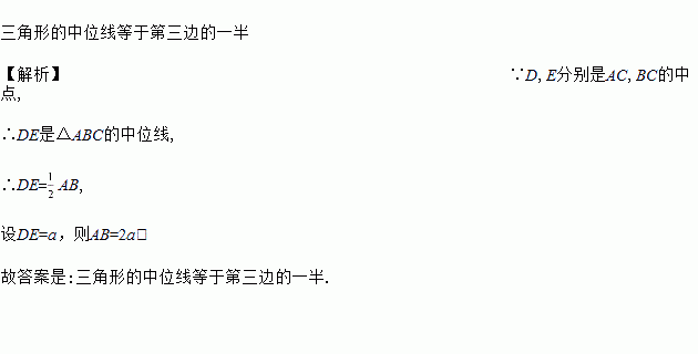 如图,A、B两点被池塘隔开,在AB外选一点C,连接AC、BC,取AC、BC的中点D、E,量出DE=a,则AB=2a,它的根据是________.