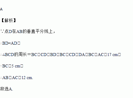 在三角形ABC中,AB=AC,BC=5 cm,作AB的垂直平分线交AC于点D,连接BD,如果△BCD的周长是17 cm,那么AB的长为( )