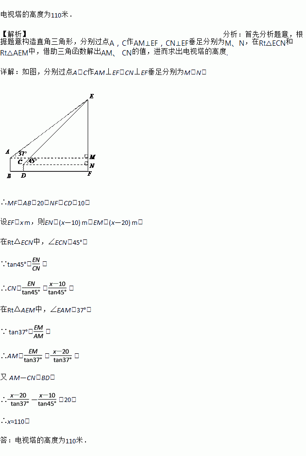 如图,甲楼AB高20 m,乙楼CD高10 m,两栋楼之间的水平距离BD=20 m,小丽在乙楼楼顶C处观测电视塔塔顶E,测得仰角为45°,求电视塔的高度EF.