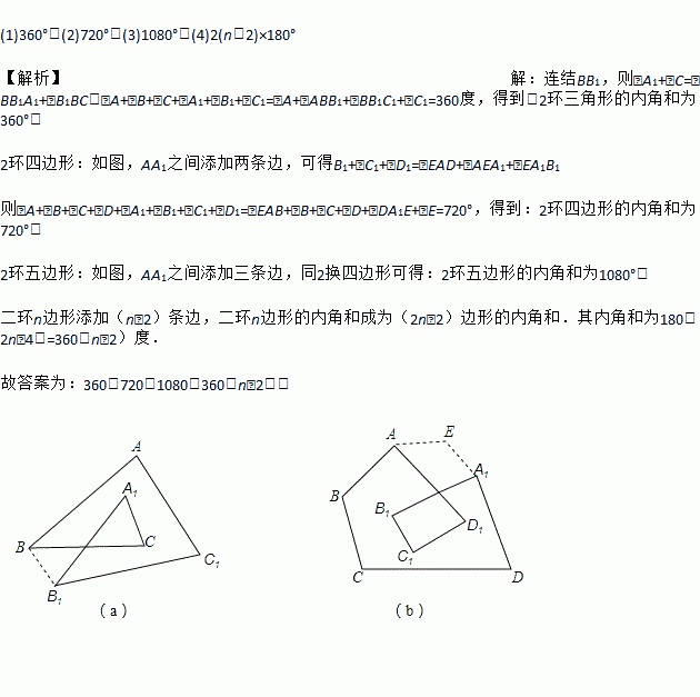 (1)360°;(2)720°;(3)1080°;(4)2(n-2)×180° 【解析】【解析】 连结BB1,则∠A1+∠C=∠BB1A1+∠B1BC,∠A+∠B+∠C+∠A1+∠B1+∠C1=∠A+∠ABB1+∠BB1C1+∠C1=360度,得到:2环三角形的内角和为360°; 2环四边形:如图,AA1之间添加两条边,可得B1+∠C1+∠D1=∠EAD+∠AEA1+∠EA1B1 ...