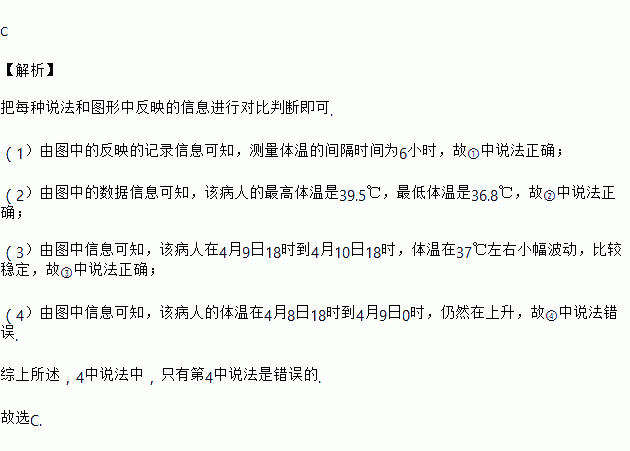 下图是北京怀柔医院一位病人在4月8日6时到4月10日18时的体温记录示意图,下列说法中,错误的是