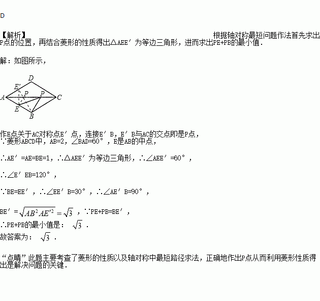 如图,菱形ABCD中,AB=2,∠BAD=60°,E是AB的中点,P是对角线AC上的一个动点,则PE+PB的最小值是( ).