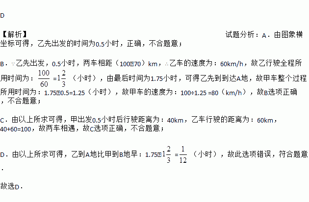 C. 甲出发0.5小时后两车相遇 D. 甲到B地比乙到A地早