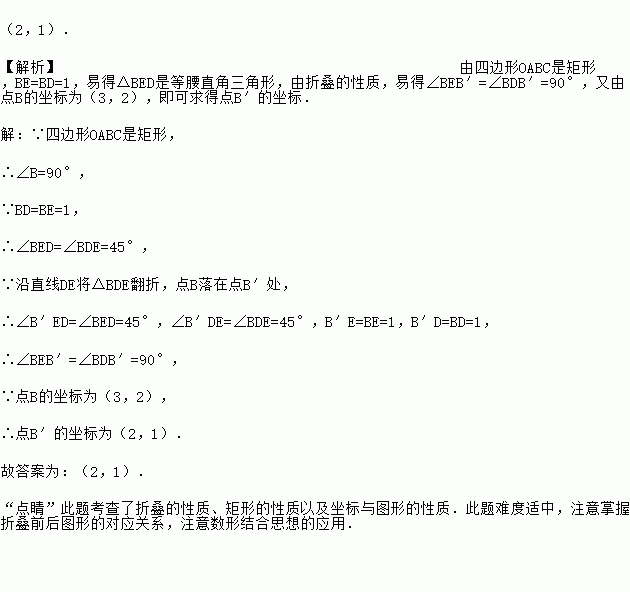 如图,矩形OABC的边OA、OC分别在x轴、y轴上,点B的坐标为(3,2).点D、E分别在AB、BC边上,BD=BE=1.沿直线DE将△BDE翻折,点B落在点B′处.则点B′的坐标为_____.