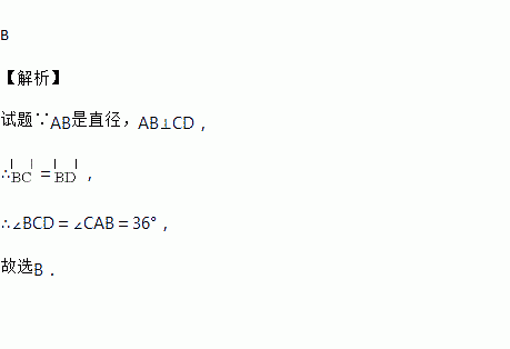 如图,⊙O的直径AB垂直于弦CD,∠CAB=36°,则∠BCD的大小是( )