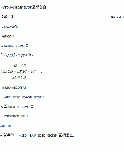 如图所示,BA⊥CA,AB∥CD,AB=CE,AC=CD,则△ABC≌______,理由是_____,所以∠ABC=______,∠ACB=______,由此可知BC与DE的位置关系为__________.