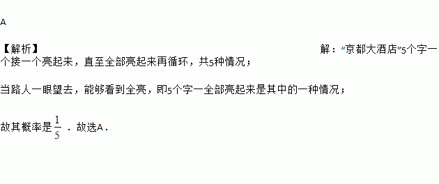 广告牌上“京都大酒店”几个字是霓虹灯,几个字一个接一个亮起来,直至全部亮起来再循环,当路人一眼望去,能够看到全亮的概率是( )