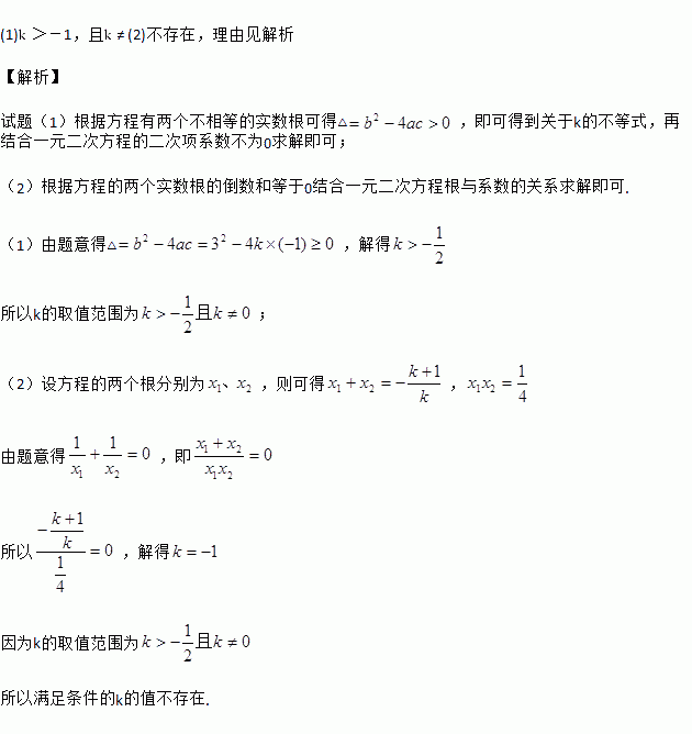 (2)是否存在实数,使方程的两个实数根的倒数和等于0?若存在,求出的值;若不存在,说明理由.