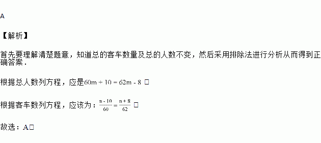 在一次革命传统教育活动中,有n位师生乘坐m辆客车若每辆客车乘60人,则还有10人不能上车,若每辆客车乘62人,则最后一辆车空了8个座位![]()