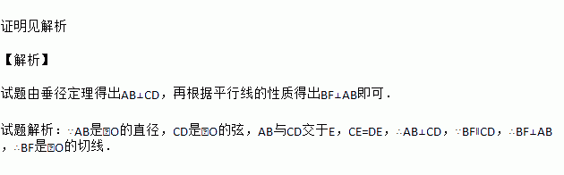 已知AB是⊙O的直径,CD是⊙O的弦,AB与CD交于E,CE=DE,过B作BF∥CD,交AC的延长线于点F,求证:BF是⊙O的切线.
