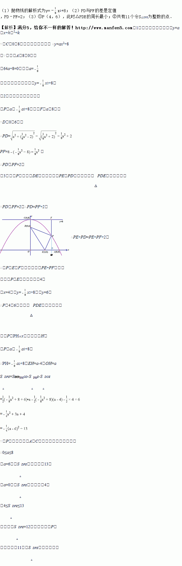 如图,抛物线的顶点坐标为C(0,8),并且经过A(8,0),点P是抛物线上点A,C间的一个动点(含端点),过点P作直线y=8的垂线,垂足为点F,点D,E的坐标分别为(0,6),(4,0),连接PD,PE,DE.