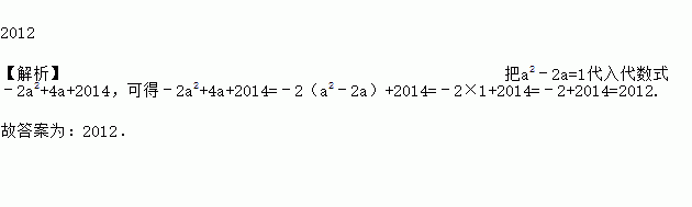 2012 【解析】把a2﹣2a=1代入代数式﹣2a2+4a+2014,可得﹣2a2+4a+2014=﹣2(a2﹣2a)+2014=﹣2×1+2014=﹣2+2014=2012. 故答案为:2012.