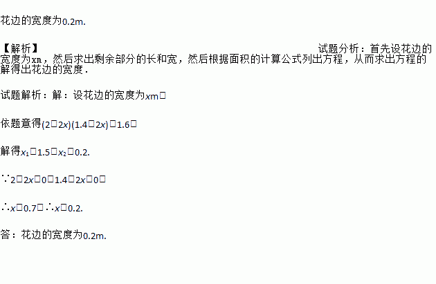 如图,在一张矩形的床单四周绣上宽度相等的花边,剩下部分面积为1.6m2,已知床单的长是2m,宽是1.4m,求花边的宽度.