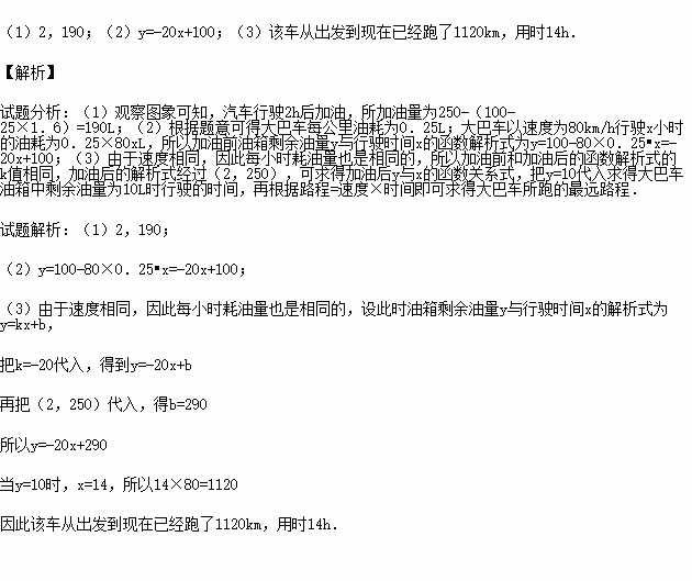 (3)若当油箱中剩余油量为10L时,油量表报警,提示需要加油,大巴车不再继续行驶,则该车最远能跑多远?此时,大巴车从出发到现在已经跑了多长时间?