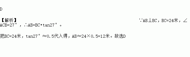 在“测量旗杆的高度”的数学课题学习中,某学习小组测得太阳光线与水平面的夹角为27°,此时旗杆在水平地面上的影子的长度为24米,则旗杆的高度约为【 】
