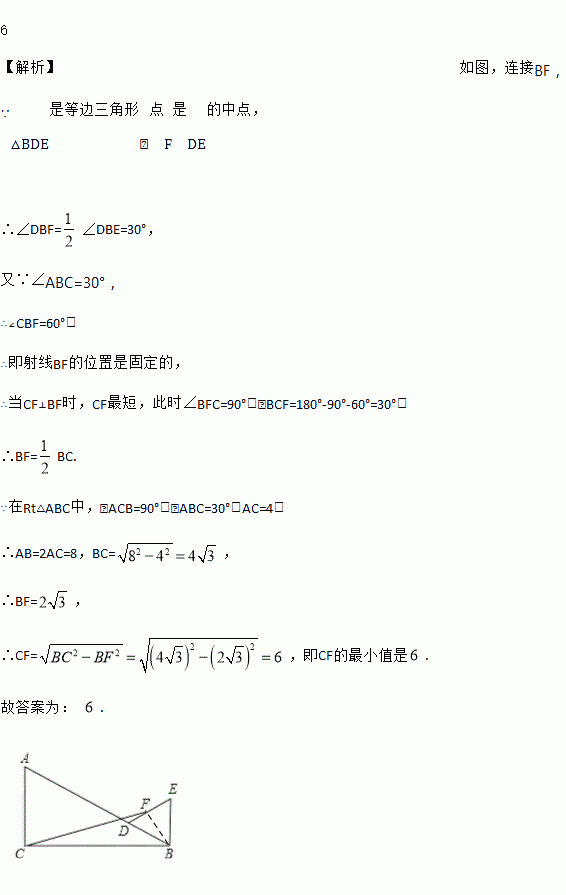 Rt△ABC中,∠ACB=90°,∠ABC=30°,AC=4,D为线段AB上一个动点,以BD为边在△ABC外作等边三角形BDE.若F为DE的中点,则CF的最小值为 _______.