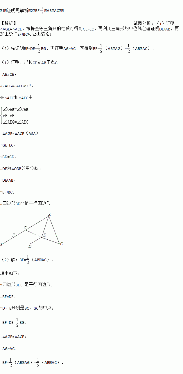 如图,在△ABC中,点D是边BC的中点,点E在△ABC内,AE平分∠BAC,CE⊥AE,点F在边AB上,EF∥BC.