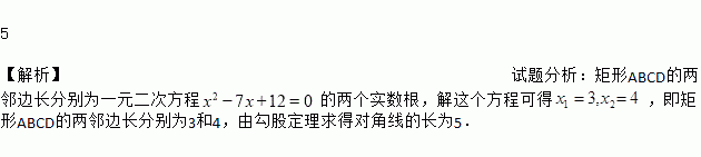 5 【解析】试题分析:矩形ABCD的两邻边长分别为一元二次方程的两个实数根,解这个方程可得,即矩形ABCD的两邻边长分别为3和4,由勾股定理求得对角线的长为5.