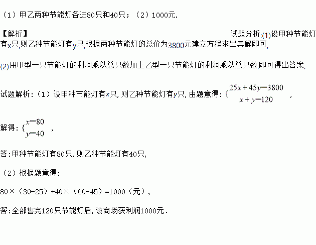 (1)甲乙两种节能灯各进80只和40只;(2)1000元. 【解析】试题分析:(1)设甲种节能灯有x只,则乙种节能灯有y只,根据两种节能灯的总价为3800元建立方程求出其解即可, (2)用甲型一只节能灯的利润乘以总只数加上乙型一只节能灯的利润乘以总只数.即可得出答案. 试题解析:(1)设甲种节能灯有x只,则乙种节能灯有y只,由题意得: , 解得: , 答:甲种节能灯有...