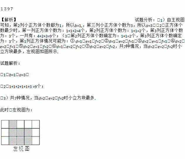 用小立方块搭一个几何体,使它从正面和上面看到的形状如下图所示,从上面看到形状中小正方形中的字母表示在该位置上小立方块的个数,请问: