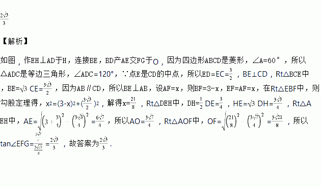 如图,在菱形纸片ABCD中,AB=3,∠A=60°,将菱形纸片翻折,使点A落在CD的中点E处,折痕为FG,点F,G分别在边AB,AD上,则tan∠EFG的值为________ .