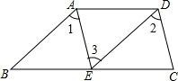 分析:可以证明AE∥DC,首先根据AB∥DE,可得∠1=∠3,再根据条件∠1=∠2,可得∠3=∠2,根据内错角相等,两直线平行可得AE∥DC.