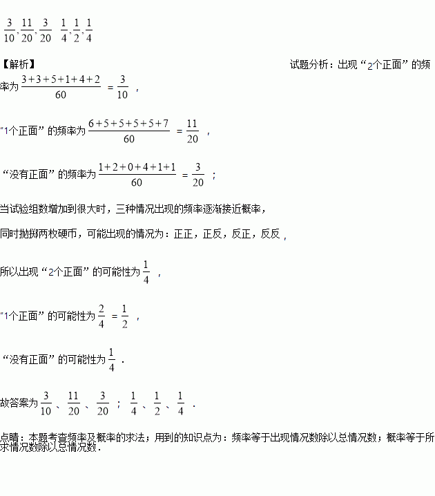 由上表结果,计算得出现“2个正面”、“1个正面”和“没有正面”这3种结果的频率分别是___________________.当试验组数增加到很大时,请你对这三种结果的可能性的大小作出预测:______________.