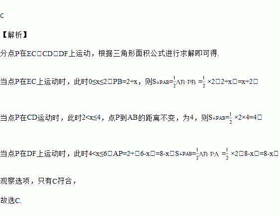 如图,矩形ABCD中,E,F分别是线段BC,AD的中点,AB=2,AD=4,动点P沿EC,CD,DF的路线由点E运动到点F,则△PAB的面积s是动点P运动的路径总长x的函数,这个函数的大致图象可能是