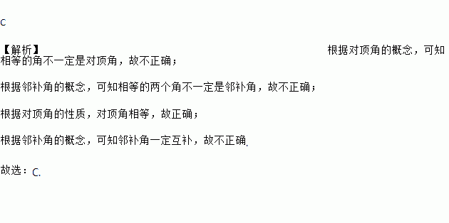 A. 相等的角是对顶角 B. 相等的两个角是邻补角