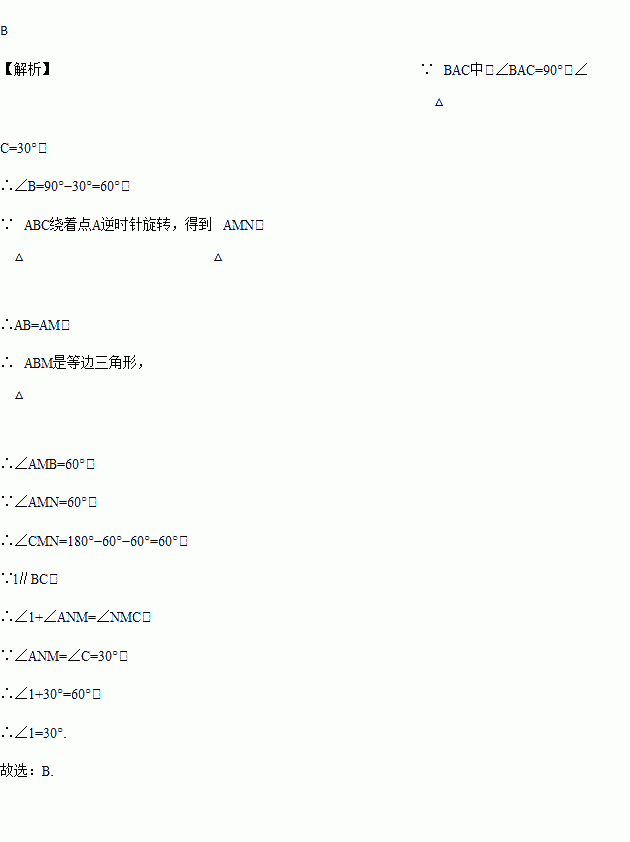 将△ABC绕着点A逆时针旋转,得到△AMN,使得点B落在BC边上的点M处,过点N的直线