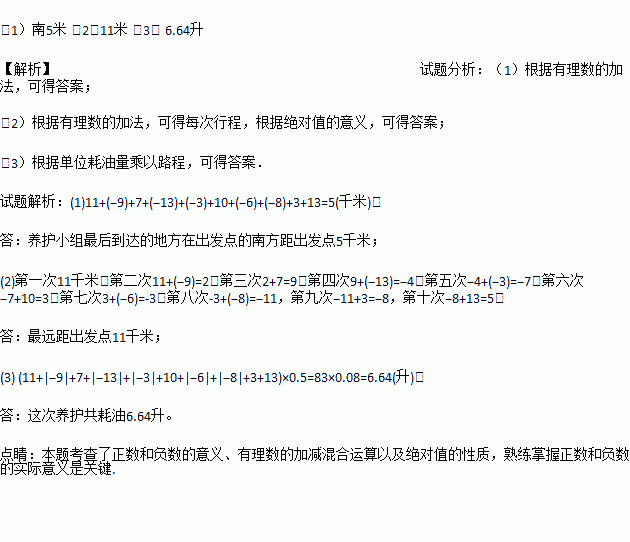 国庆期间,响水县高速公路养护小组,乘车沿南北向公路巡视维护,如果约定向南为正,向北为负,当天的行驶记录如下(单位:千米) +11,-9,+7,-13,-3,+10,-6,-8,+3,+13