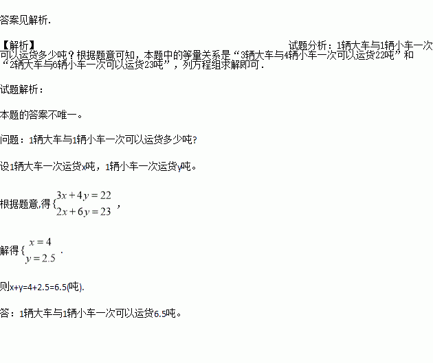 由大小两种货车,3辆大车与4辆小车一次可以运货22吨,2辆大车与6辆小车一次可以运货23吨.请根据以上信息,提出一个能用二元一次方程组解决的问题,并写出这个问题的解答过程.